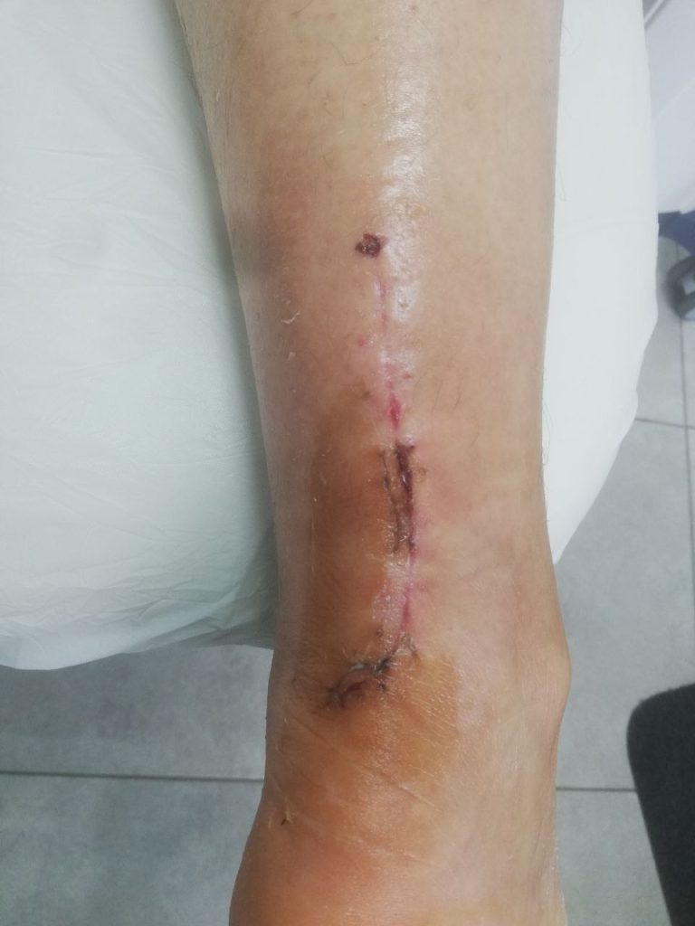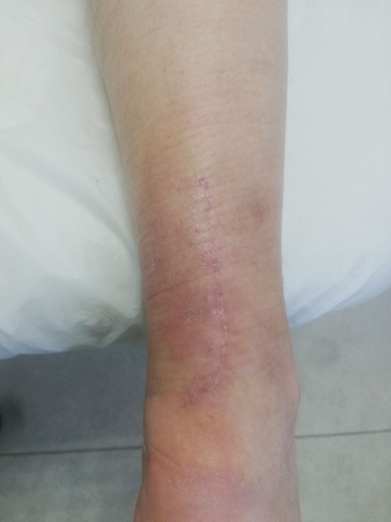 На фото состояние после травмы и после хирургического восстановления связок голени и стопы, сохраняется боль и нарушение функции стопы